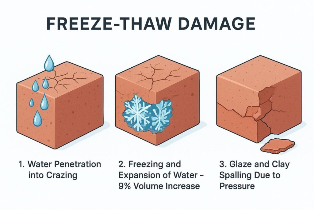 In winter, this trapped water freezes and expands, putting pressure on the material from the inside. Over time, this leads to surface spalling and cracking.