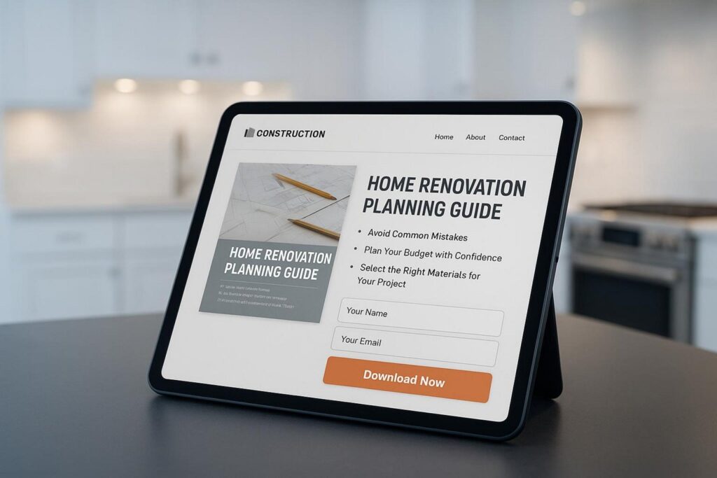 These tools position your company as an expert and give visitors real value. Your promotional text for these offers should make it clear what people will learn or gain. For example: “Get Our Free Planning Guide for a Stress-Free Remodel.” Keep the form short and only ask for the details you truly need, so more people complete it.